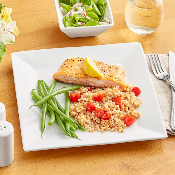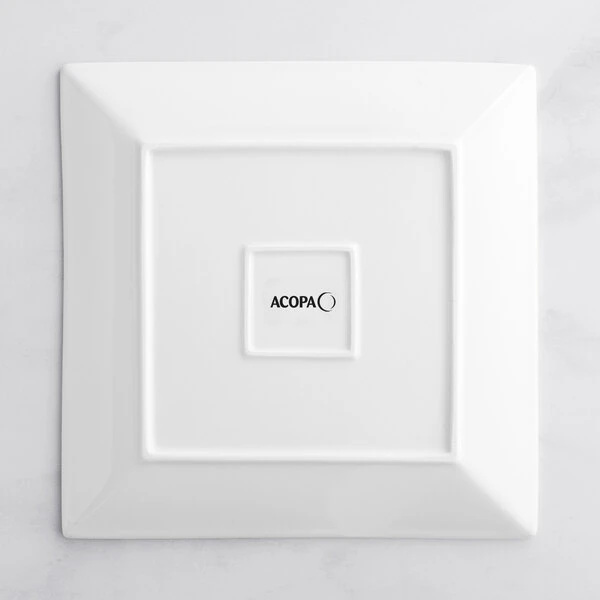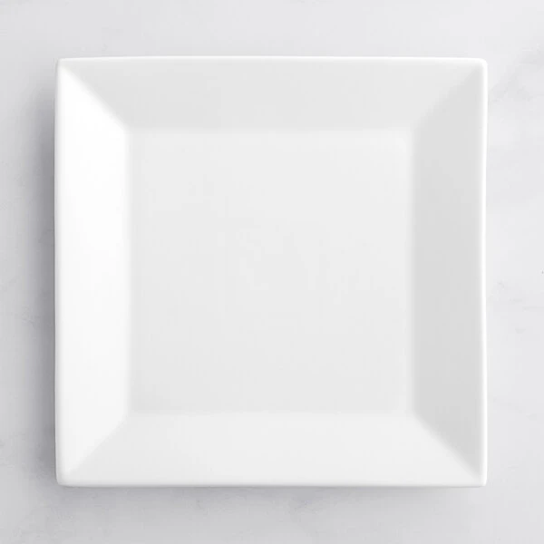For a trendy departure from traditional dinnerware, serve your menu items on this stunning Acopa 10" square bright white porcelain plate! This plate combines simplicity and style to add elegance to your tabletop. Its chic, 10" square design is great for serving main entrees and shared platters, while the crisp, bright white color enhances any style or color of table linens, dinnerware accessories, or table settings.