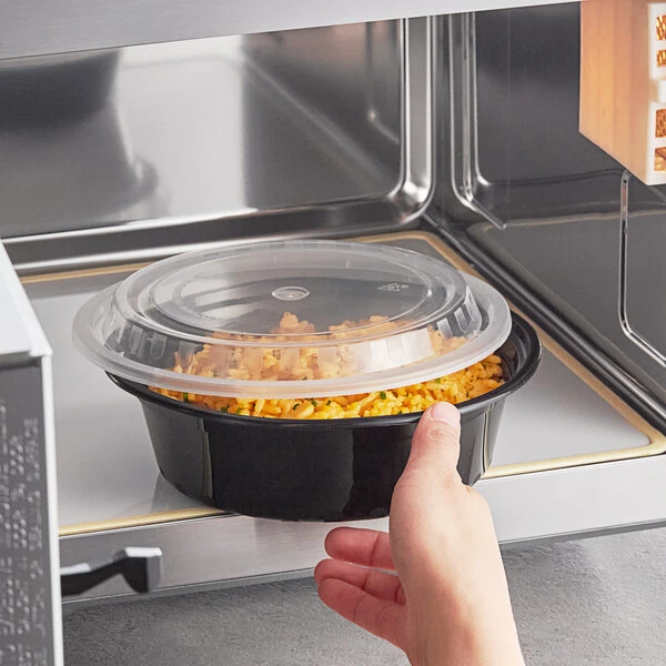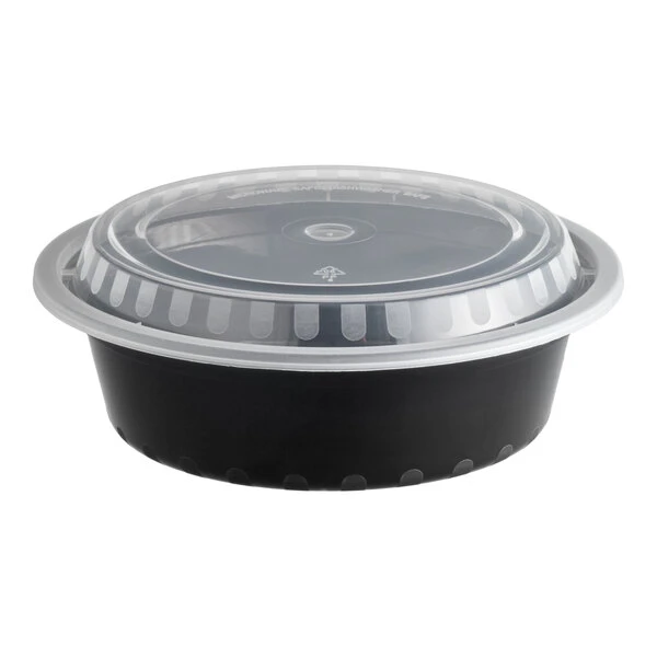 Coming as a combo, this black container includes a clear, tight-fitting lid for optimal product visibility and protection from messes and spills. Its ample capacity makes it perfect for housing salads, pastas, and entrees, and its flat top and bottom ensures easy stacking in to-go bags. Use it for packaging food at your kiosk, food truck, convenience store, or restaurant!